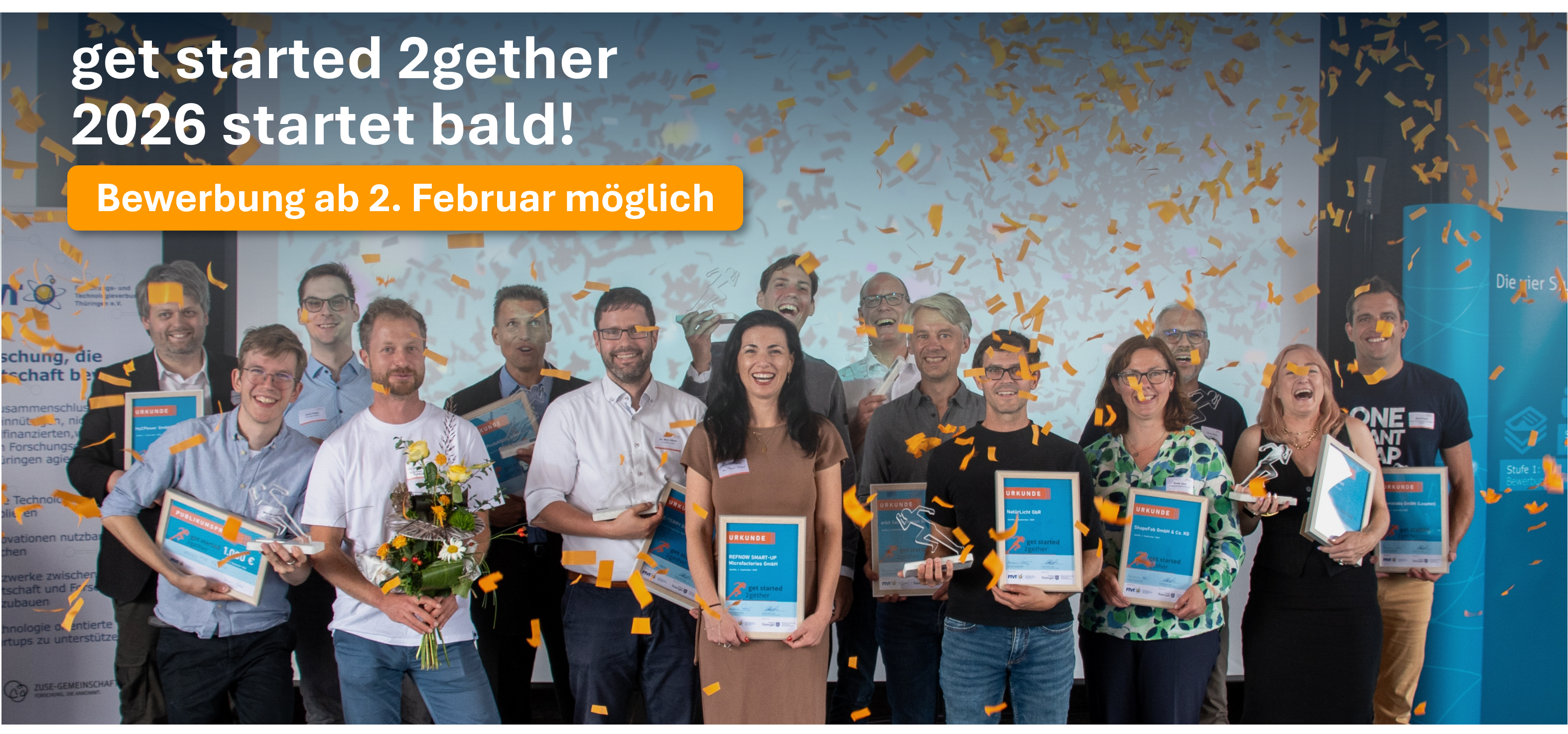 Beim Wettbewerb "get started 2gether" habt ihr mit eurem Startup die Gelegenheit, eure innovative Technologie mit einer der zehn wirtschaftsnahen Forschungseinrichtungen in Thüringen gemeinsam zu beforschen und weiterzuentwickeln. Zusätzlich erhaltet ihr die Gelegenheit, von dem umfassenden Netzwerk und den zahlreichen Kontakten in den gemeinnützigen wirtschaftsnahen Forschungseinrichtungen (WINAFO) zu profitieren. Das Programm soll euch helfen, schnell auf die nächsten technologischen Stufen zu springen – let’s get started 2gether!